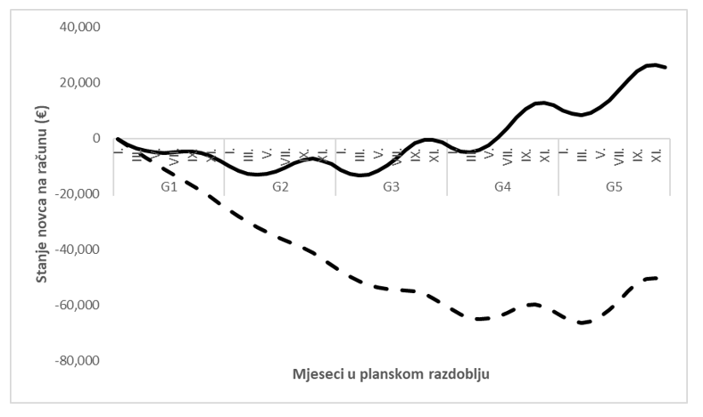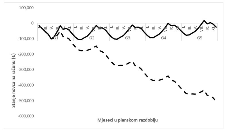 Druga simulacijska opcija pretpostavlja ulaganje EZG u postrojenja za proizvodnju energije. Proizvedena energija dijeli se sa svim članovima po određenom ključu. Na grafikonu 2 prezentirana su stanja novca na računu za dvije mogućnosti ovisne o cijeni dijeljene energije. Prva (puna crna krivulja) se odnosi na cijenu dijeljene energije u iznosu od 0.087 €/kWh dok se druga (isprekidana crna krivulja) mogućnost odnosi na nominalnu cijenu iz prve mogućnosti umanjene za 20% (0.0696 €/kWh). U okviru prve mogućnosti poslovanje EZG će, uz privremeno korištenje kratkoročnih izvora financiranja deficita, biti financijski održivo dok će se u okviru druge mogućnosti deficit kontinuirano povećavati, tj. poslovanje EZG neće biti financijski održivo. Iz prezentiranih rezultata dade se zaključiti da je financijski održivo poslovanje u slučaju kada EZG investira u postrojenje osjetljivo na cijenu dijeljene energije. No, valja skrenuti pozornost da konačna cijena dijeljene energije u ovom slučaju ovisi o brojnim drugim parametrima kao što su, na primjer, jedinična cijena dobave i ugradnje postrojenja, troškovi održavanja i nadzora, rok otplate tuđih izvora financiranja, struktura izvora financiranja ugradnje postrojenja, cijena izvora financiranja i slično. Slučaj druge simulacijske opcije intenzivnija je od prve u pogledu potreba za financiranjem.