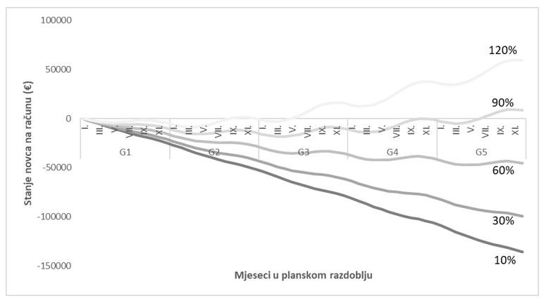 Iz projekcije računa prihoda i rashoda (PR-RAS) vidi se da, ukoliko bi akvizicija članova bila sporija, tj. ukoliko bi se članovi proizvođači energije uključivali u EZG dinamikom opisanom u tablici 1 (sporija akvizicija), u tri od pet poslovnih godina EZG bi poslovala s manjkom prihoda nad rashodima, odnosno, da bi se tek u četvrtoj (G4) poslovnoj godini trend promijenio u uzlazni. Kratkotrajna aktiva (tablica 4) sastoji se od salda potraživanja od članova po osnovi ispostavljenog računa za uslugu obračuna dijeljene energije. Na transakcijskom računu je saldo 0 jer je njegova protustavka (kratkoročni tuđi krediti) pozitivna, a u naravi se odnosi na okvirni kredit po poslovnom računu. Zbog nedostatnih prihoda nad rashodima poslovanje EZG bilo bi obilježeno deficitom koji se namiruje tek nakon proteka 5 poslovnih godina. U projekciji izvještaja o novčanim tokovima razvidno je smanjenje deficita iz poslovnih aktivnosti, a na pozicijama financijskih aktivnosti prikazano je povećanje kratkoročnih izvora financiranja (okvirni kredit po poslovnom računu) i početak njegovog smanjenja u zadnjoj poslovnoj godini (G5).