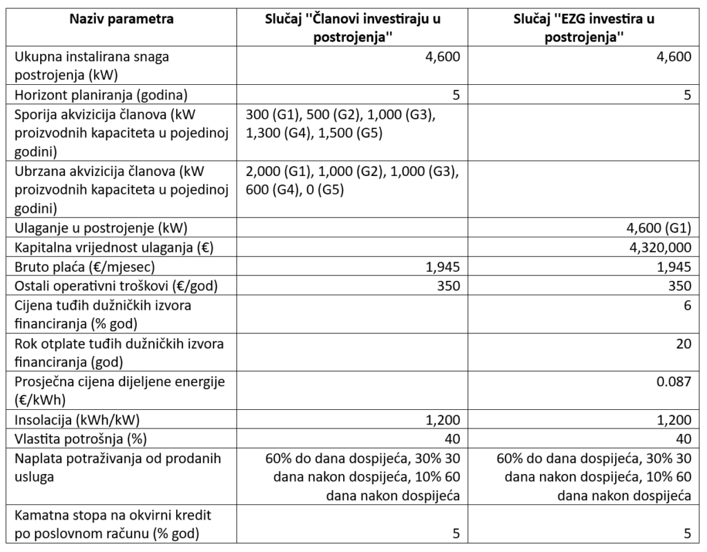 Projekcija vrijednosti simulacijskog modela temelji se na vrijednostima ulaznih parametara. U slučaju simulacije poslovanja EZG najznačajniji ulazni parametri su podatci o kapacitetima proizvodnje, cijene usluge obračuna dijeljene energije, vrijednost ulaganja u postrojenje te podatci o operativnim troškovima. Na temelju varijacija vrijednosti navedenih parametara moguće je donijeti ocjenu o financijski održivom poslovanju. Naravno, promjena ulaznih parametara, na primjer uslijed promjene propisa kojima se uređuje poslovanje EZG u RH, rezultirat će promijenjenim izlaznim vrijednostima. Vrijednosti parametara za navedene dvije simulacijske opcije prikazane su u tablici 1: